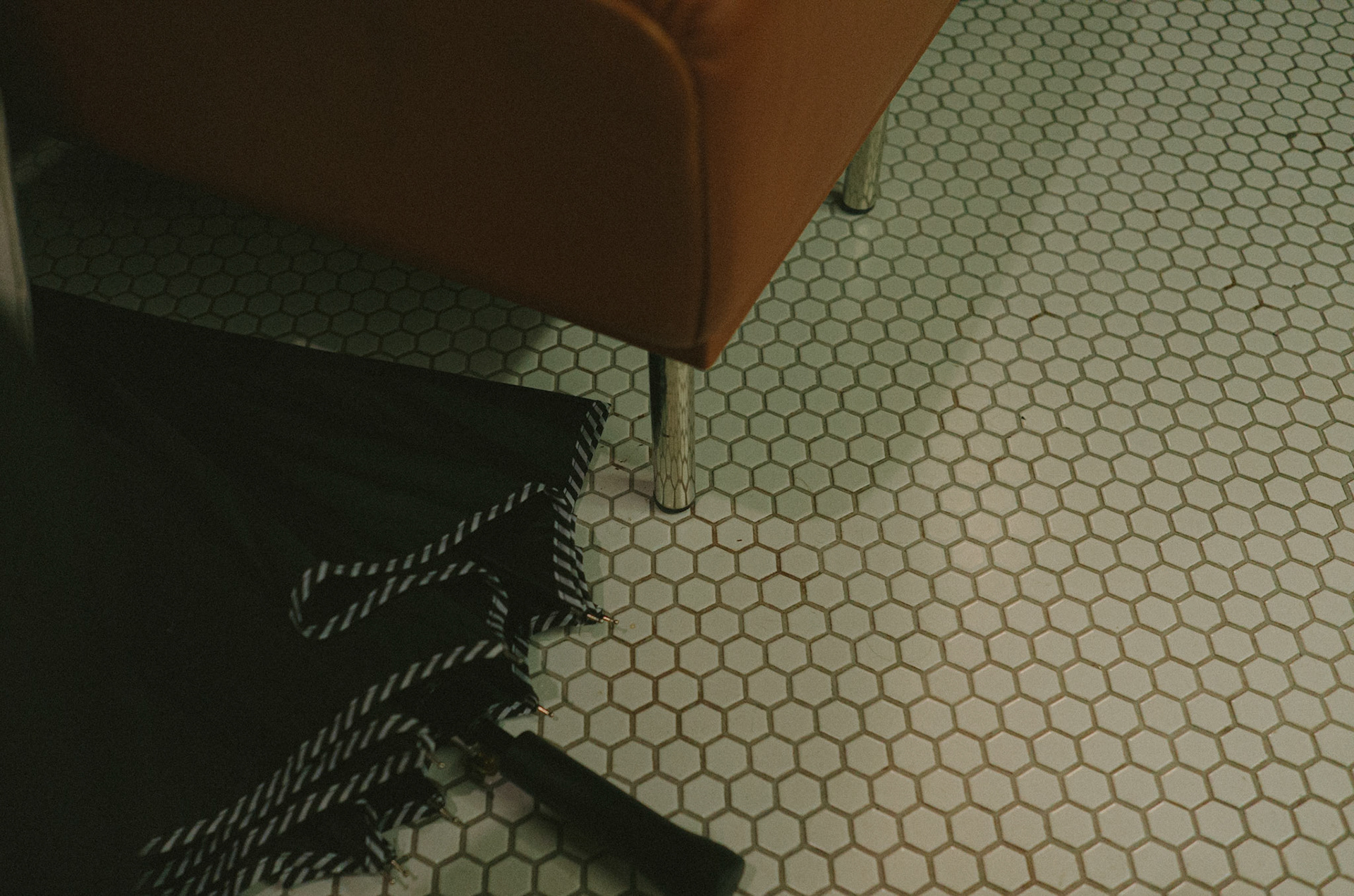 브라운 색상의 가죽 소파와 감각적인 컬러로 매치한 카이저이델 6786. ( 너무 탐나던... ) / 크림컬러의 벽과 나난 작가의 롱롱타임플라워 프레임과 루이스폴센 판텔라. / 비에 젖은 검은색 장우산과 바닥 타일.